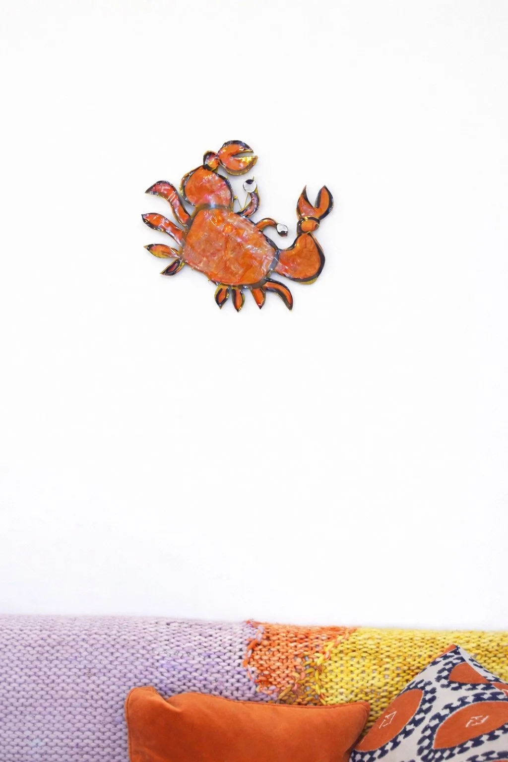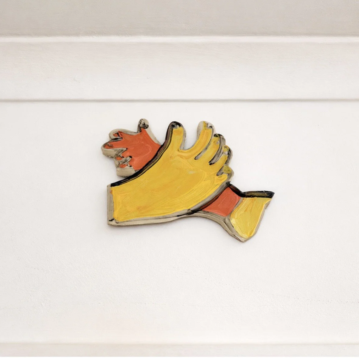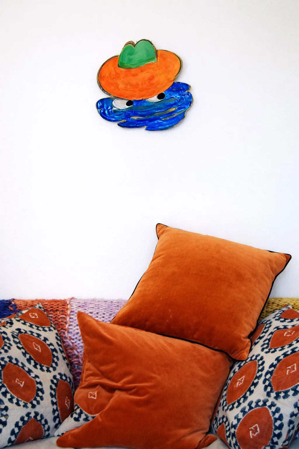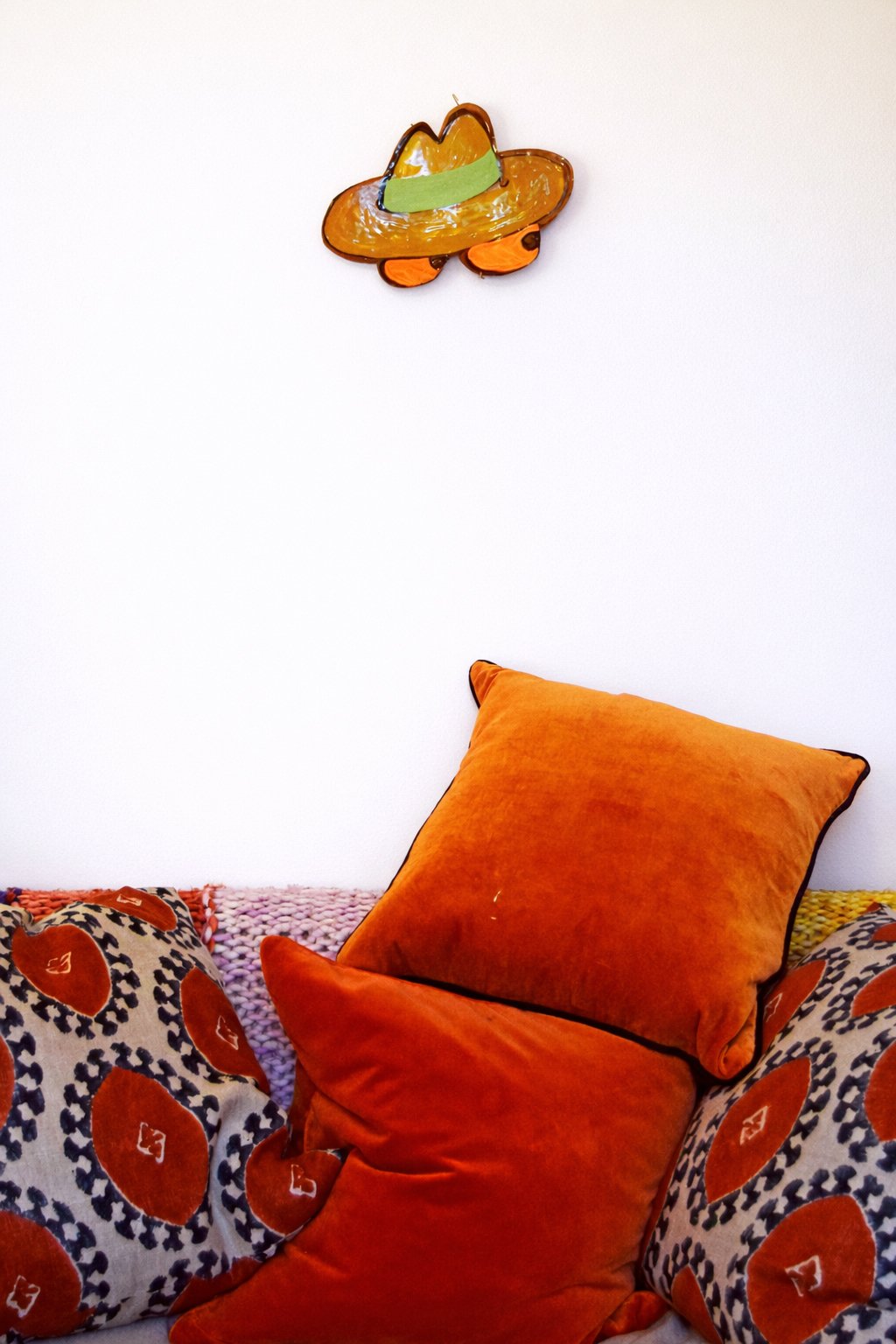 Just Tired; glazed ceramic and enamel, photographed on the wall at home with cushion and laundry, 2025