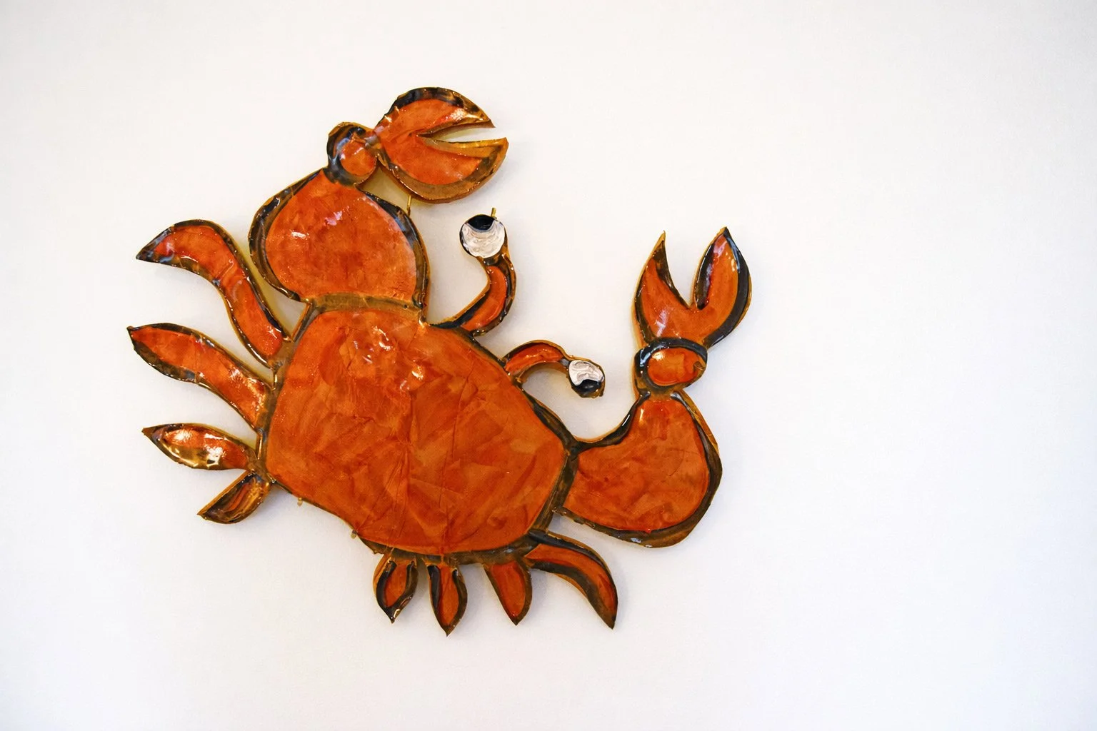 Hired Gun in the swamp and the sea chased by a crocodile and a rampant crab. Ceramic, enamel, acrylic, 2025