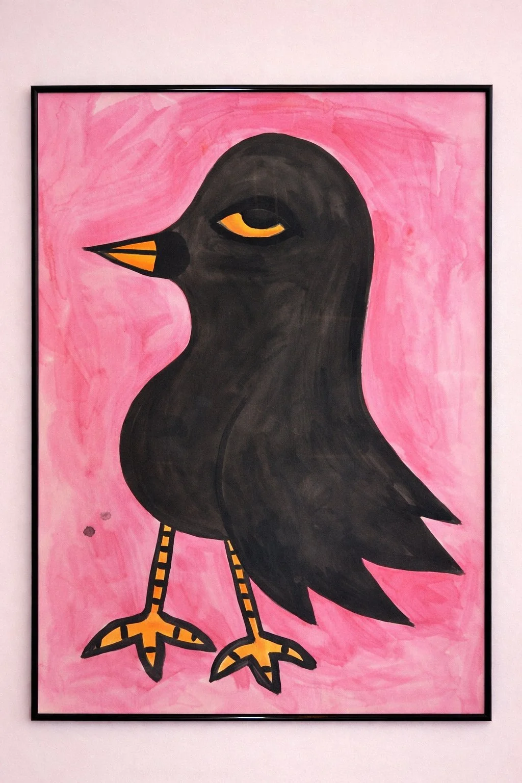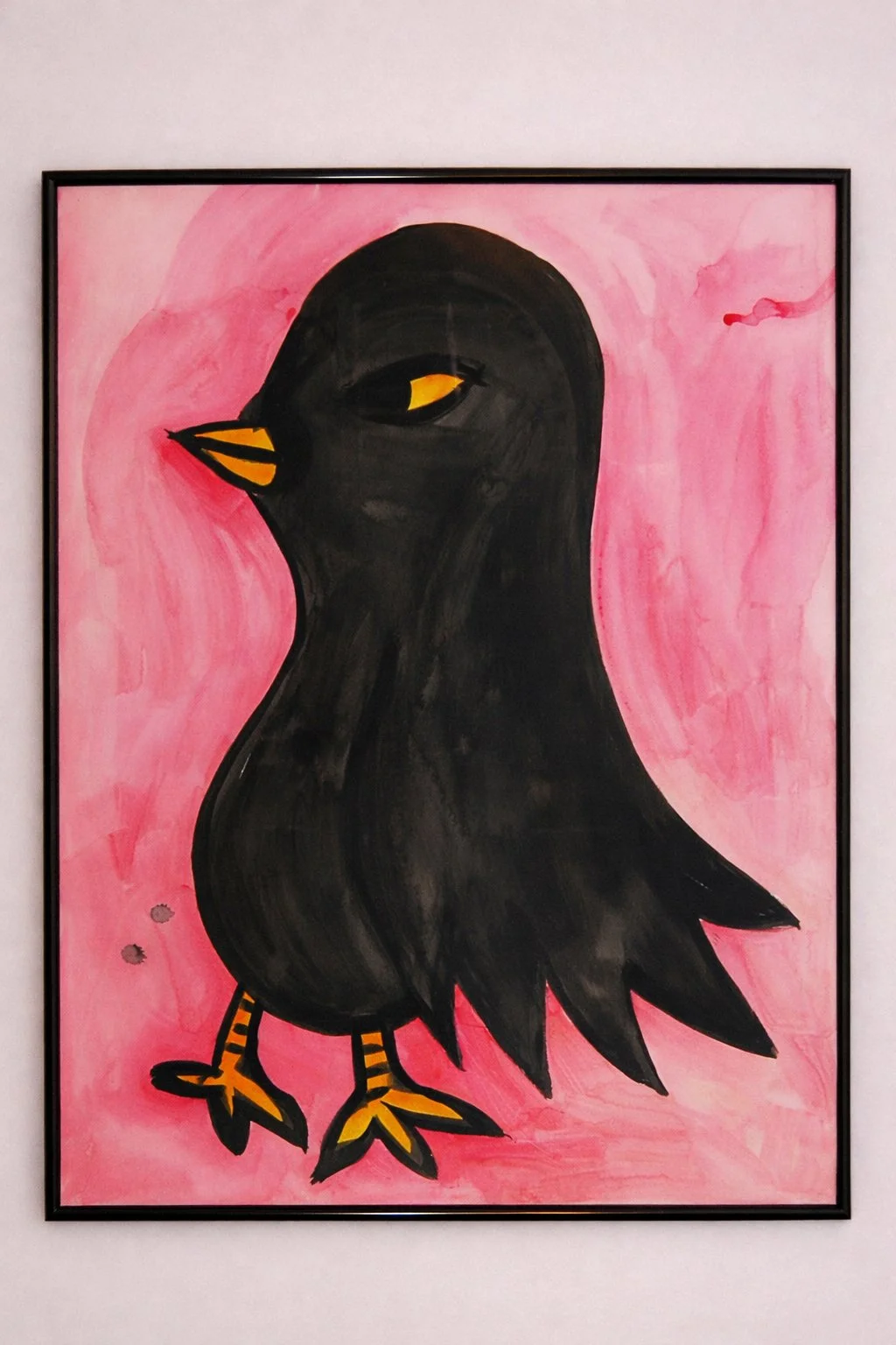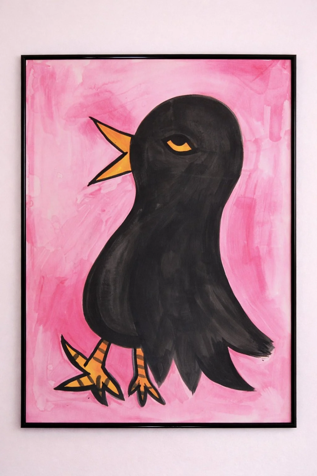 Pheonixes that also look like Elmo, flying around Acrylic on postcards and paper; 2021