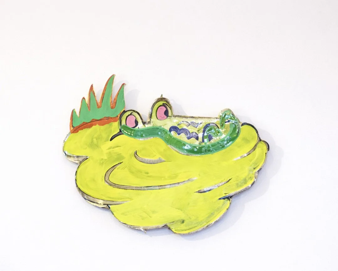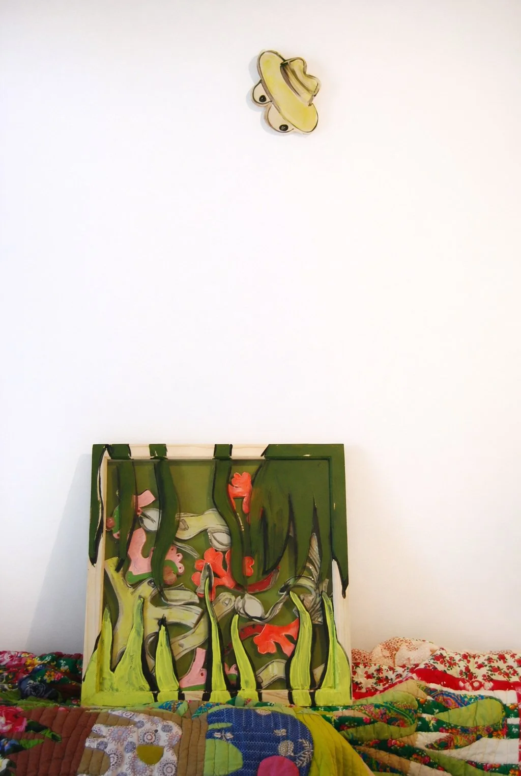 Wall Based Object isn't sure about framed jungle of artworks; enamel, glazed ceramic, wooden picture frame, acrylic; photographed with a favourite quilt; 2025